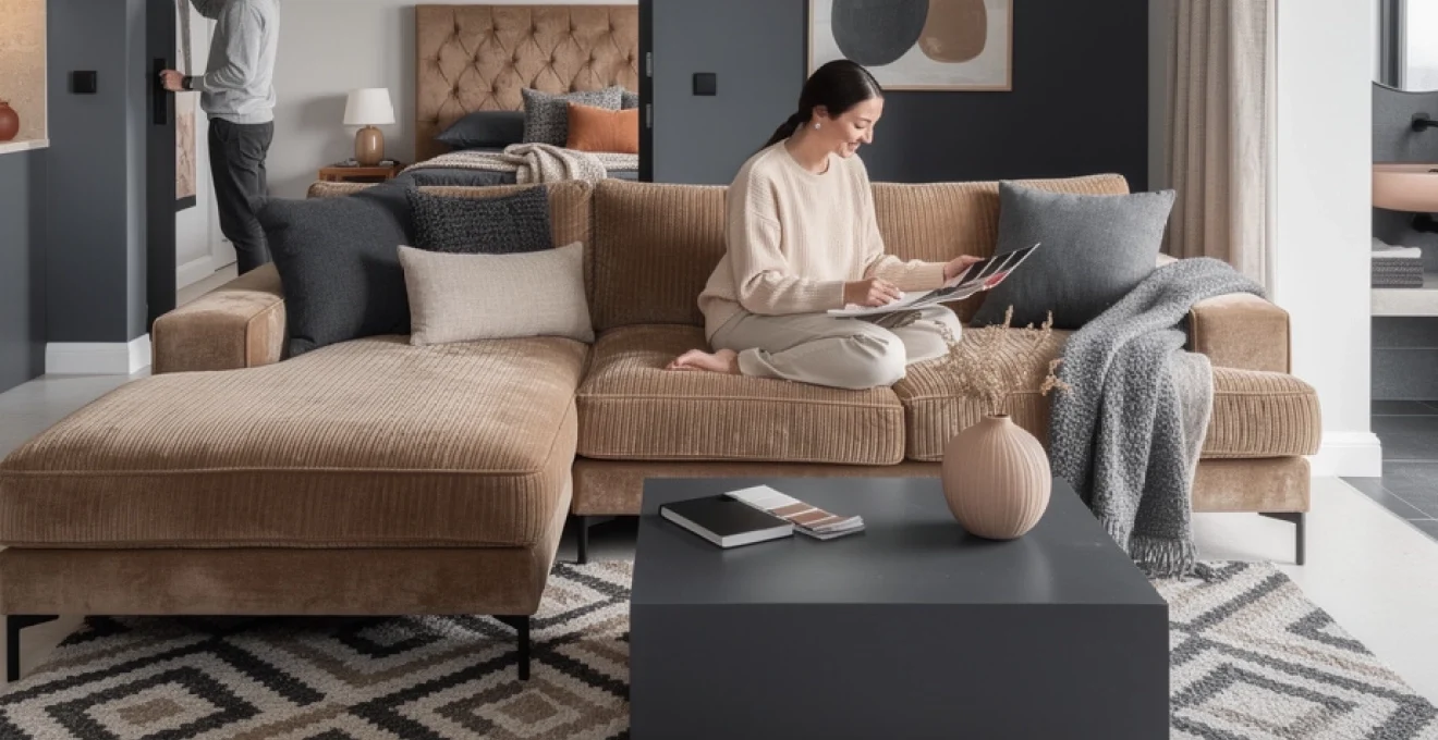Le velours côtelé taupe associé au métal brossé anthracite dans le mobilier contemporain